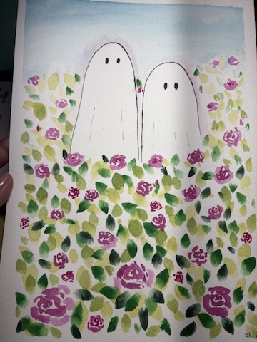 Two sweet little ghosts peek out from a lush field of pink roses and green leaves in this tender original watercolour painting. Dreamy, romantic, and a little melancholic, this piece blends ghostly softness with botanical abundance — the perfect mix of spooky and serene. Float-mounted in an 11×14″ frame to showcase the full deckled edges of the paper, it’s ready to hang and admire.