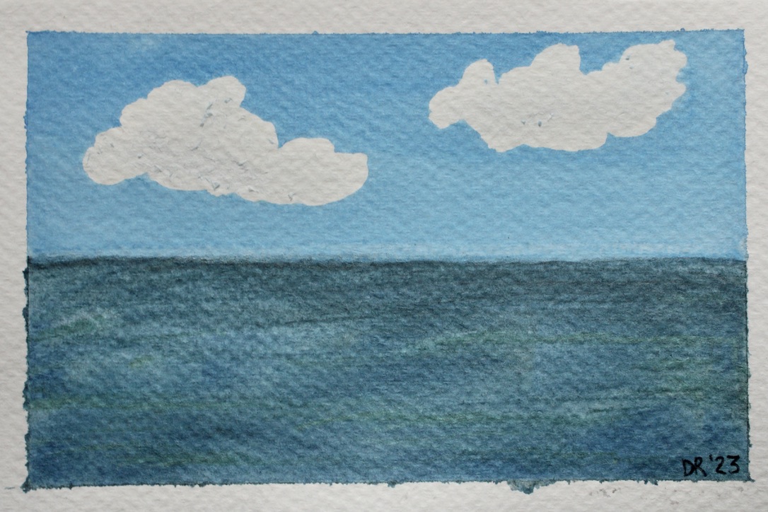 This 4×6″ original watercolour painting captures a calm, endless horizon beneath a bright blue sky. Gentle ocean tones of teal and deep blue meet the sky, while soft, billowing clouds float peacefully above. Painted on textured watercolour paper, this minimalist seascape evokes the stillness and clarity of a perfect day by the water. Ideal for adding a refreshing coastal touch to your home, office, or gallery wall, or gifting to someone who loves the sea.
