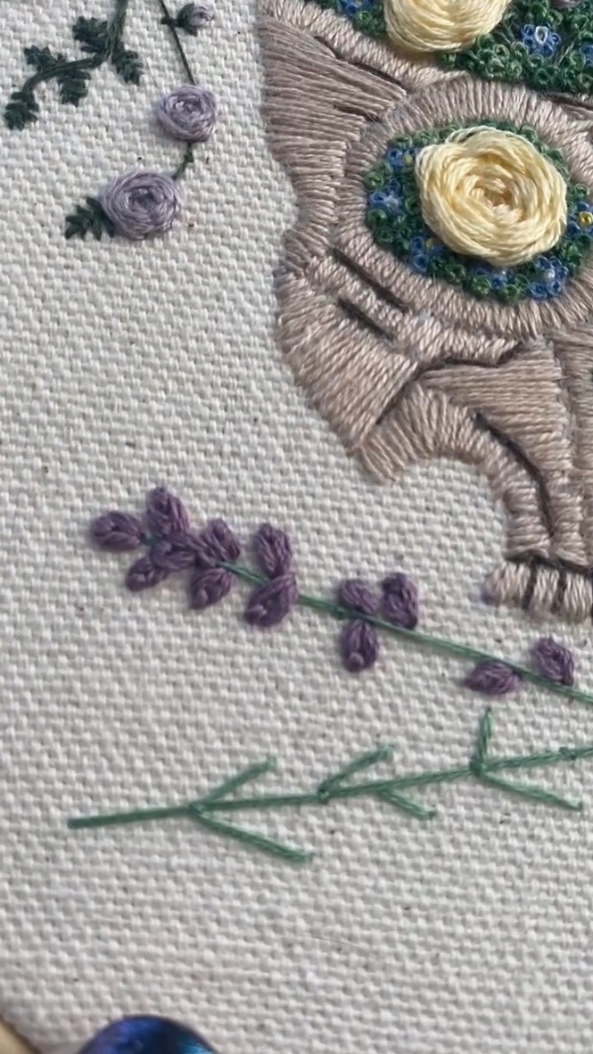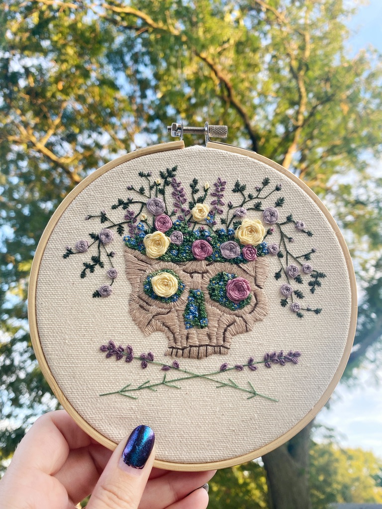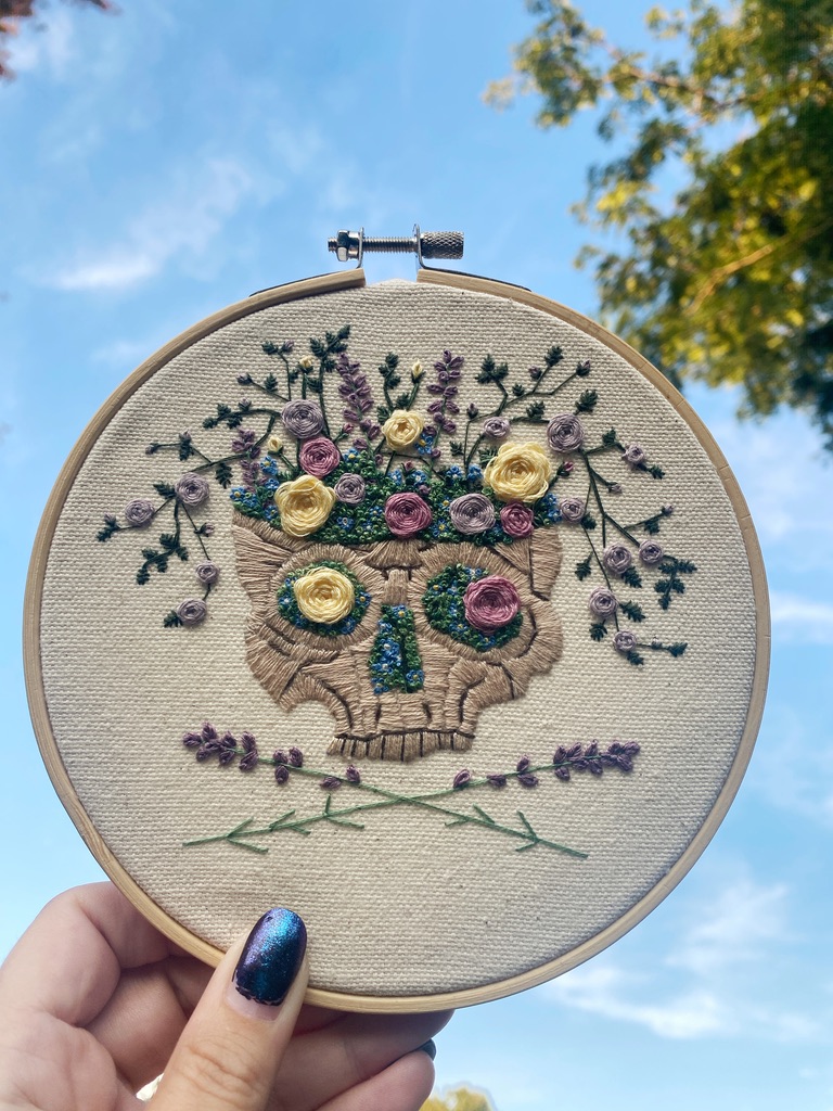Capture the essence of cottagecore charm with this enchanting 6” embroidered floral skull hoop art! This piece features a soft beige skull beautifully embroidered with wild roses, lavender, and moss, all hand-stitched on natural canvas fabric. The delicate florals, stitched with high-quality DMC embroidery thread, bring a whimsical, nature-inspired touch to the subtle skull design, creating a perfect blend of rustic elegance and pastoral beauty. The lavender stems at the bottom make a subtle skull and crossbones.