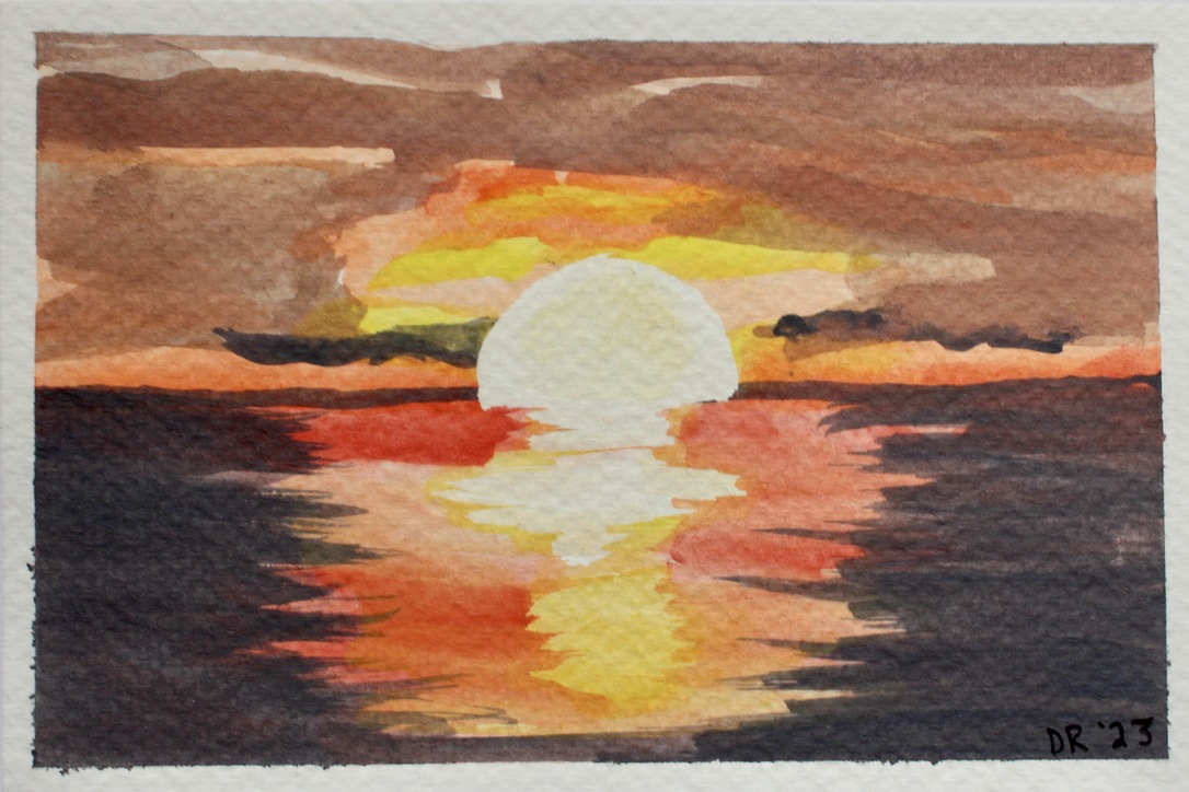 “Fiery Horizon” is a 4×6″ original watercolour painting that captures the dramatic beauty of a blazing sunset over the ocean. With warm tones of red, orange, and yellow reflecting across the waves, this piece radiates energy and passion. Bold brushstrokes bring movement to the sea while the setting sun glows at the centre, creating a striking focal point. Painted on textured cold press watercolour paper and signed by the artist, this work embodies both power and serenity. Perfect for lovers of bold skies, coastal art, or anyone seeking a vibrant accent piece for their home décor.