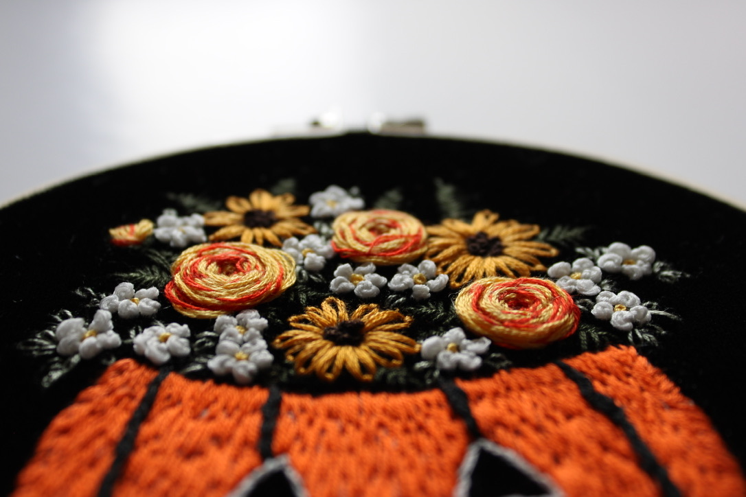 The intricately detailed pumpkin, embroidered with glow-in-the-dark accents, creates an enchanting effect after the lights go out. Surrounding the pumpkin is a vibrant arrangement of orange flowers, adding a playful pop of color that stands out against the deep velvet backdrop. Whether you’re a fan of gothic décor, love a Day of the Dead-inspired look, or simply want something eye-catching and unusual, this hoop art will make a bold statement in your home.