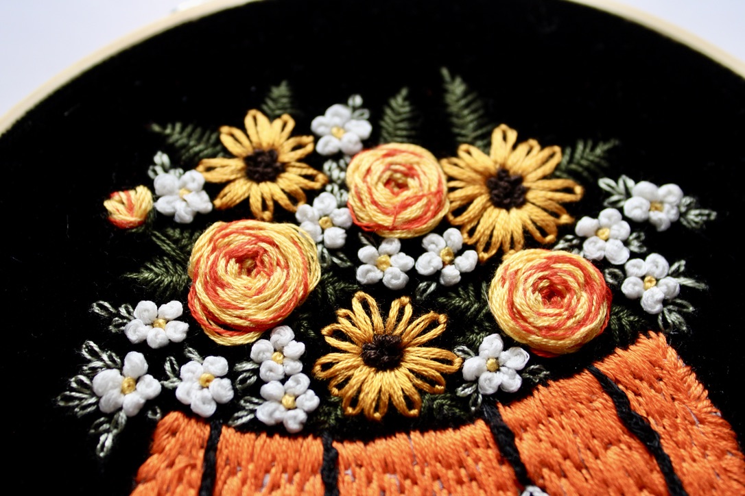 Add a touch of glow and flair to your wall with this floral pumpkin embroidery hoop—sure to light up any room in more ways than one!