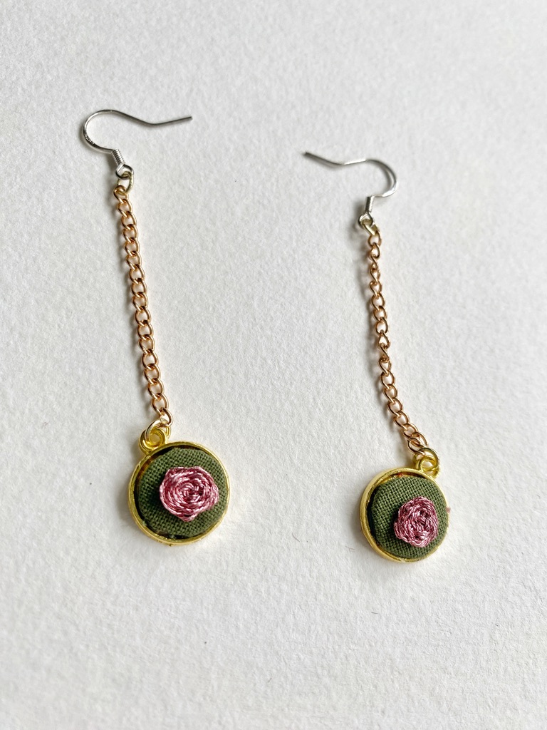 Delicate and unique, these hand-embroidered earrings feature tiny pink roses stitched onto deep green fabric, framed in a gold-toned bezel and suspended from a lightweight chain. Each pair is carefully crafted with fine embroidery techniques, making them a wearable piece of art. Perfect for adding a touch of cottagecore charm, floral elegance, or handmade originality to any outfit.