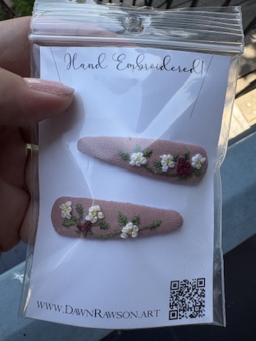 These delightful hand embroidered hairclips feature tiny raspberries & flowers hand stitched onto creamy pink fabric.