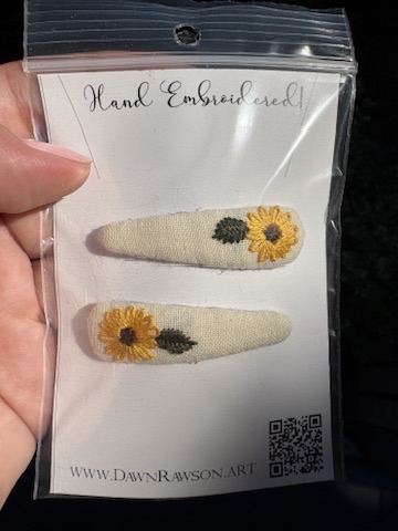 These delightful hand embroidered hairclips feature tiny sunflower flowers hand stitched onto creamy linen.