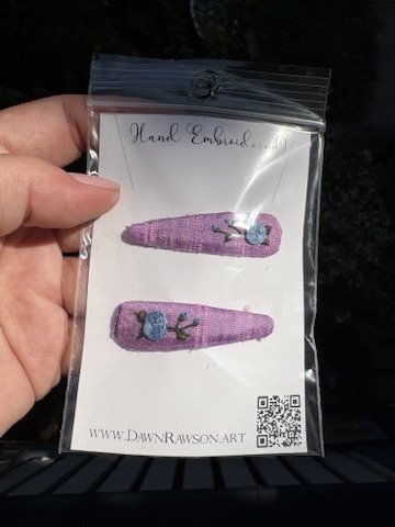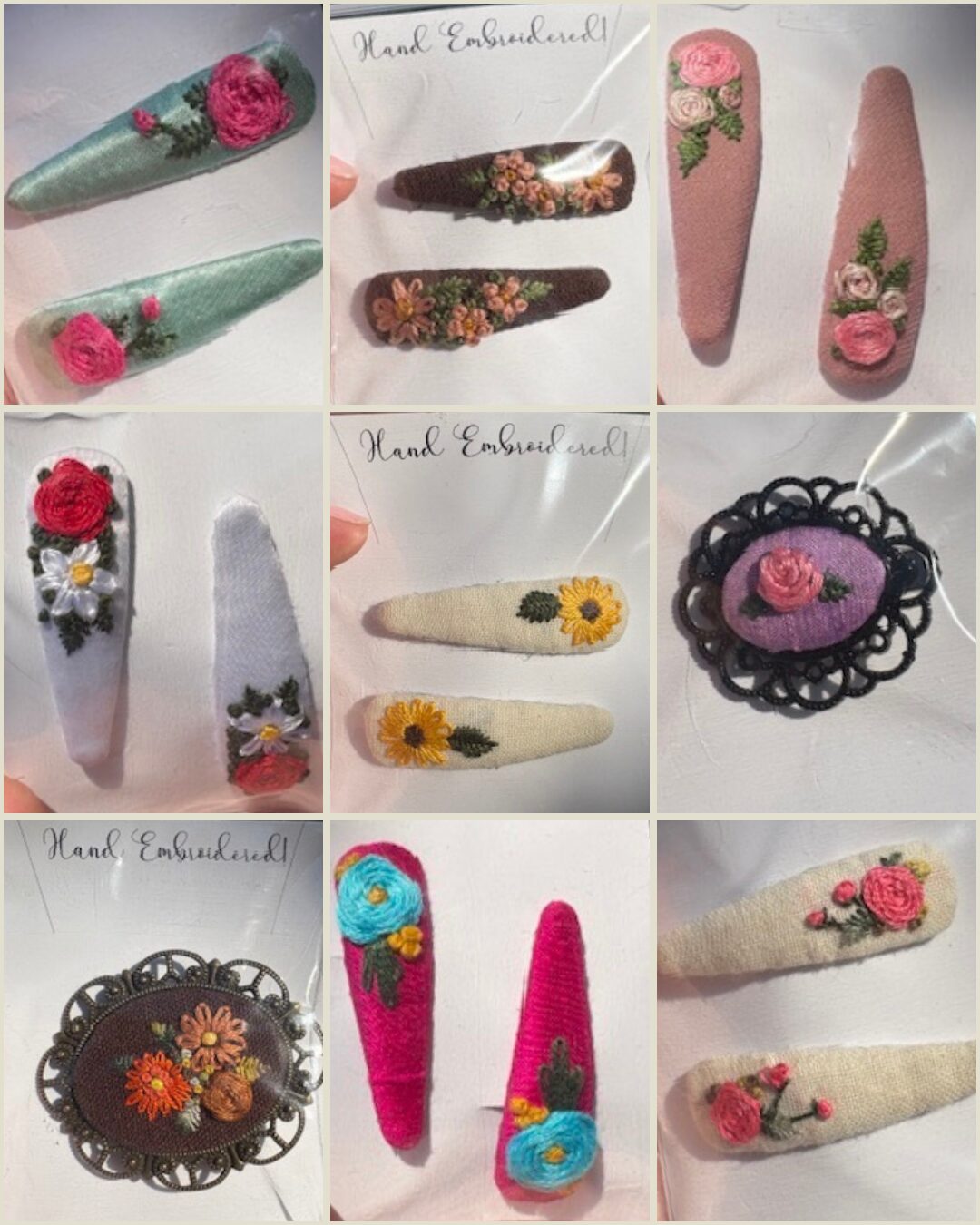These delightful hand embroidered hairclips are each individually embroidered, hand cut, and hand sewn onto a little hair clip, before having a felt backing attached, to keep the threads tidy, and help grip your hair.