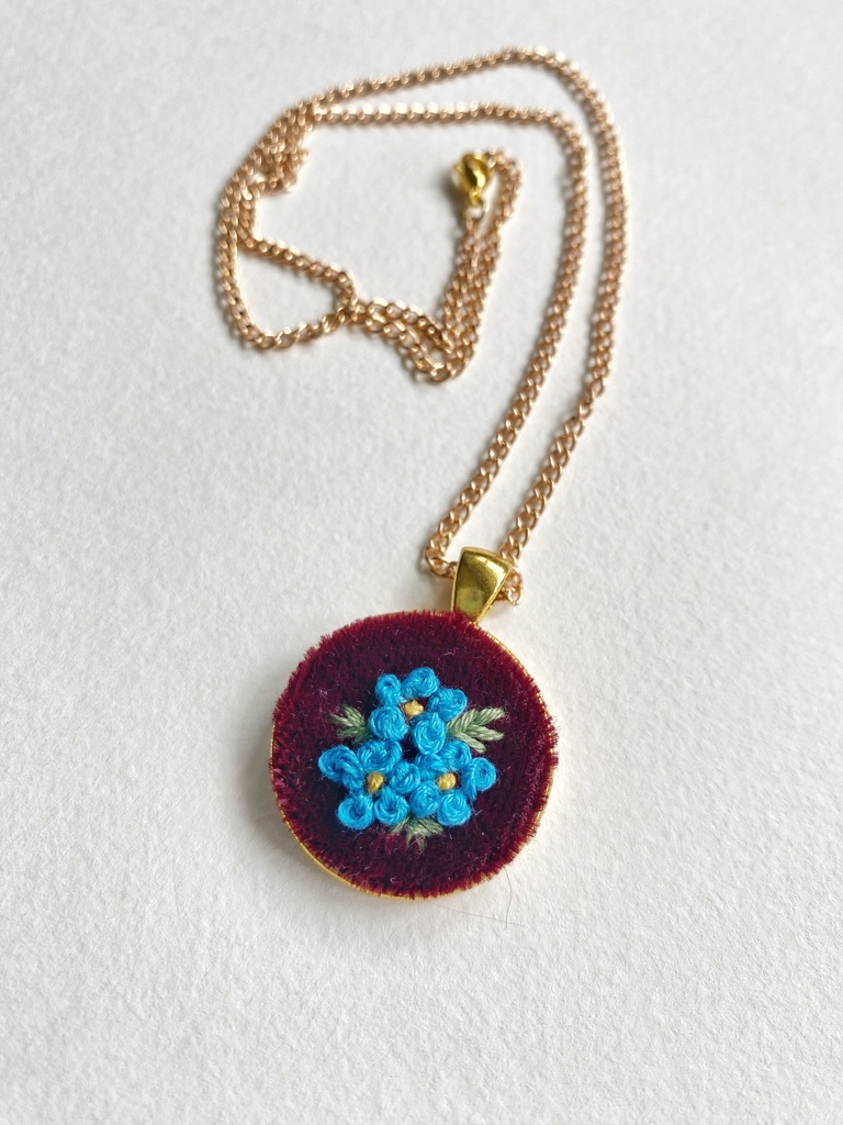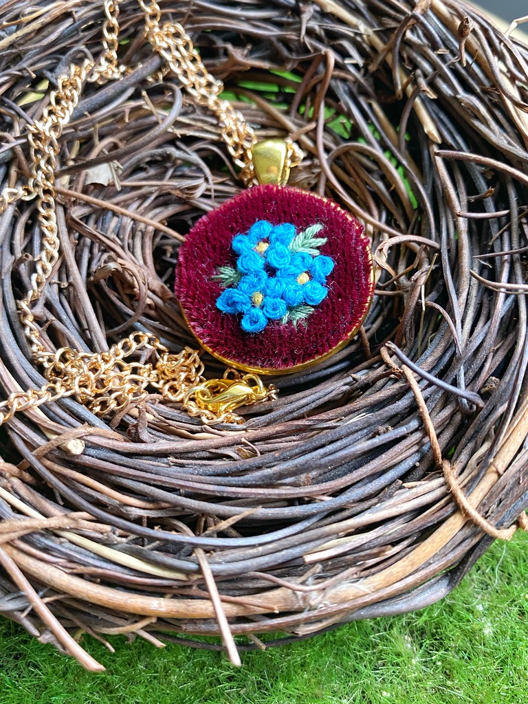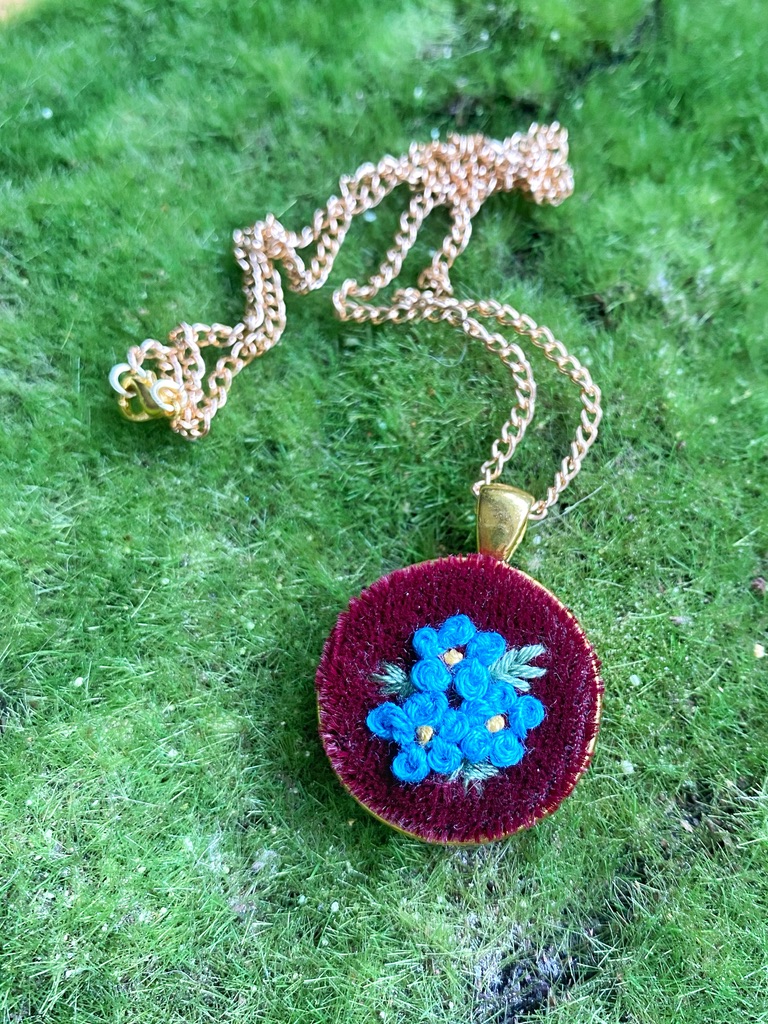 This hand-embroidered pendant necklace features bright blue florals with golden yellow centers, stitched against a rich burgundy velvet background. The luxurious texture of velvet combined with the delicate embroidery creates a striking statement piece that feels both vintage and timeless. Finished with a warm gold-tone bezel and chain, this necklace is a perfect gift for flower lovers, cottagecore enthusiasts, or anyone who appreciates unique artisan jewelry.