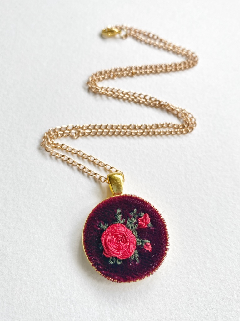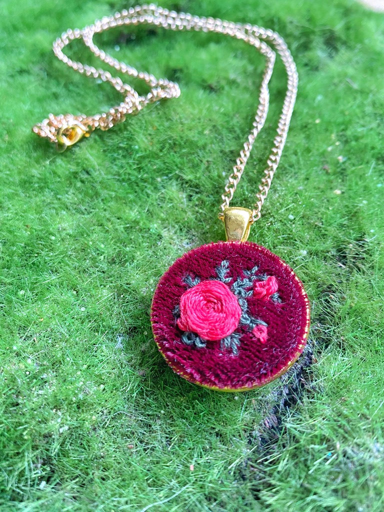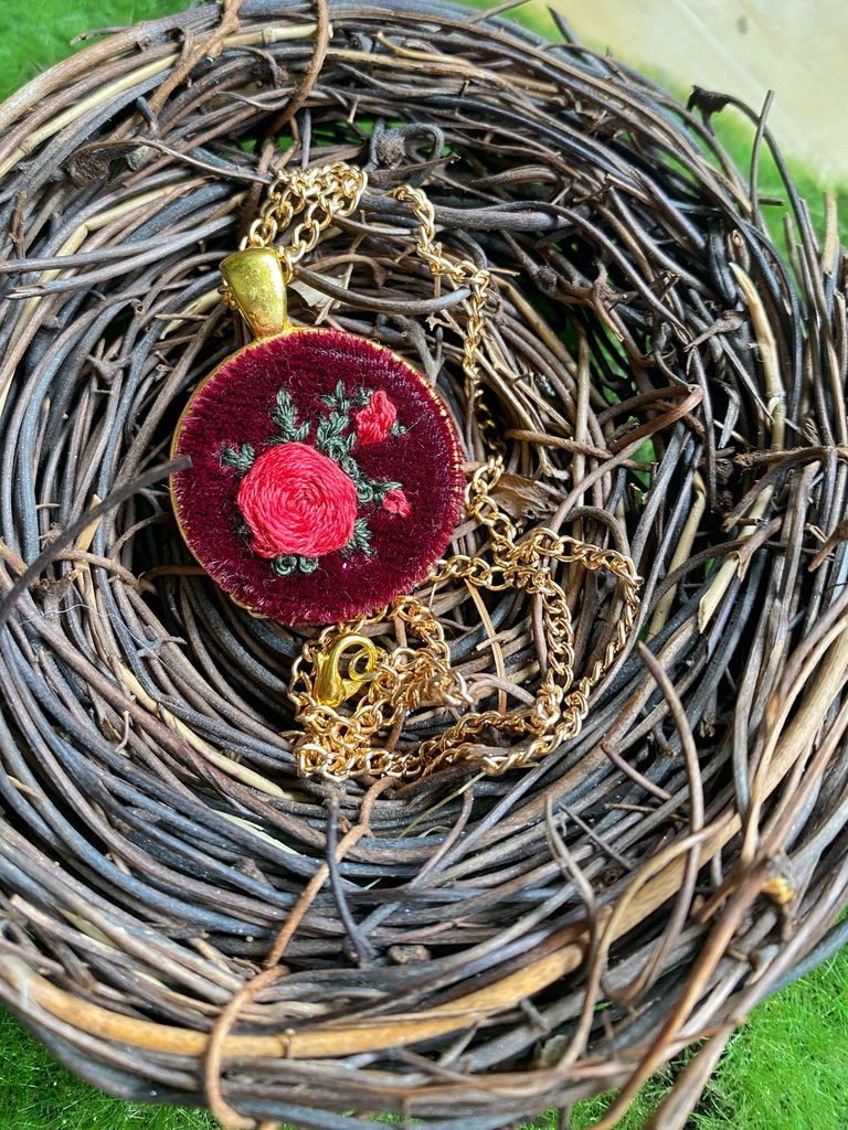Bold yet romantic, this embroidered necklace features a richly detailed red rose in bloom with a smaller bud, delicately stitched on deep burgundy velvet. The pendant is framed in a gold bezel and suspended from a matching chain, blending vintage elegance with modern cottagecore charm. Each stitch is done by hand, making this necklace a one-of-a-kind piece of wearable art. Perfect for gifting or adding a touch of timeless floral beauty to your wardrobe.
