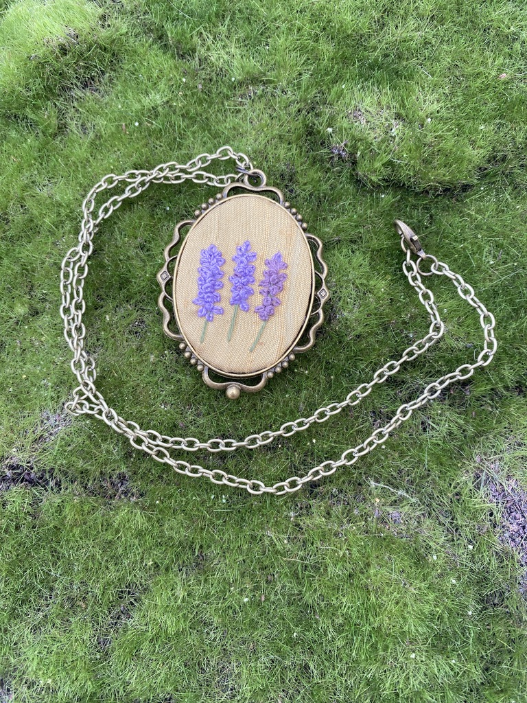 This hand embroidered necklace features a trio of delicate lavender blooms, stitched in shades of purple with fine green stems, capturing the calm and beauty of a lavender field. The flowers are set on a warm tan fabric that highlights the detail of the embroidery and framed in an ornate antique bronze oval pendant. The chain complements the rustic charm, making this piece a perfect accessory for lovers of cottagecore, nature, and handmade jewelry. Each necklace is embroidered by hand, ensuring every piece is a one-of-a-kind wearable artwork.