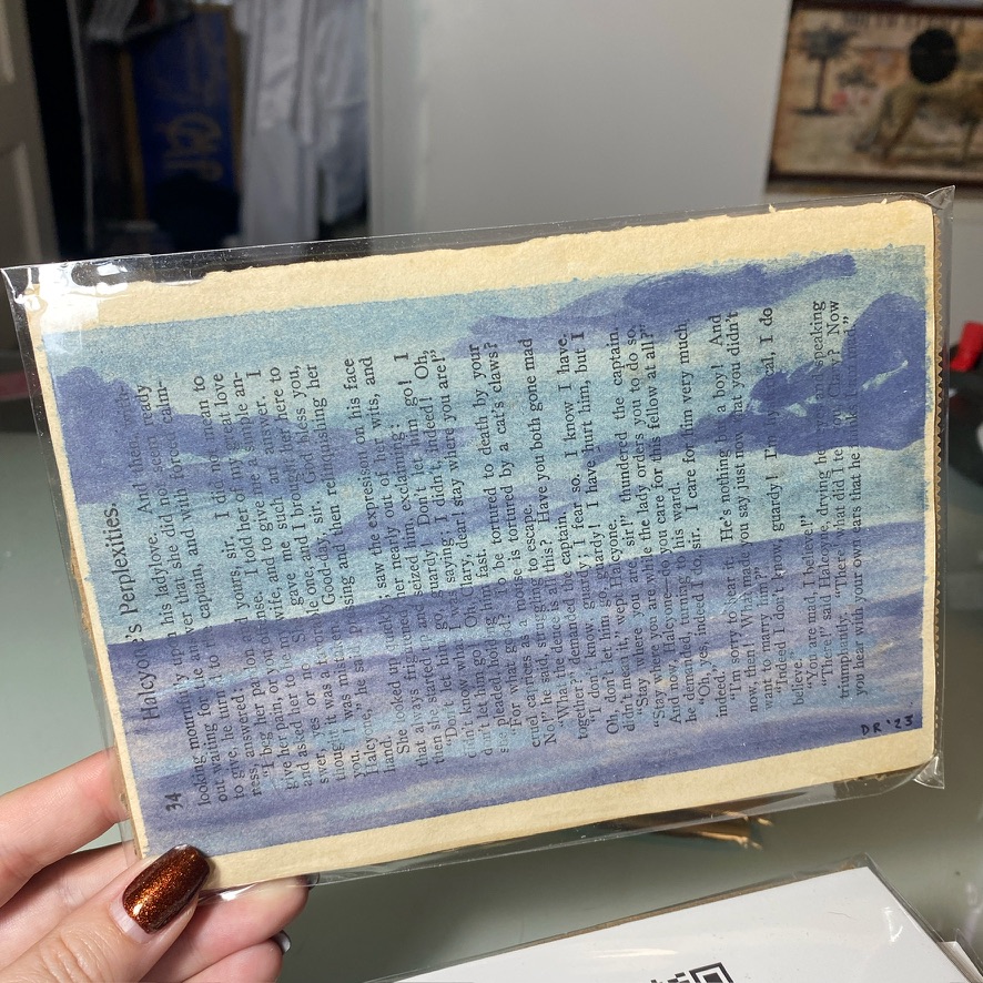 A serene ocean-inspired watercolour painted across the pages of an antique book, measuring 5″x7″. Shades of indigo, violet, and soft blue create a calm seascape with drifting clouds, where the vintage text beneath adds a textured, layered quality to the scene. This unique mixed media piece brings together the timeless beauty of literature and the tranquility of the sea, making it an ideal gift for ocean lovers, book enthusiasts, or fans of rustic coastal decor.