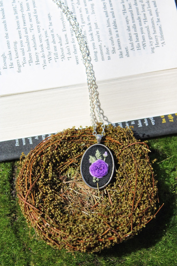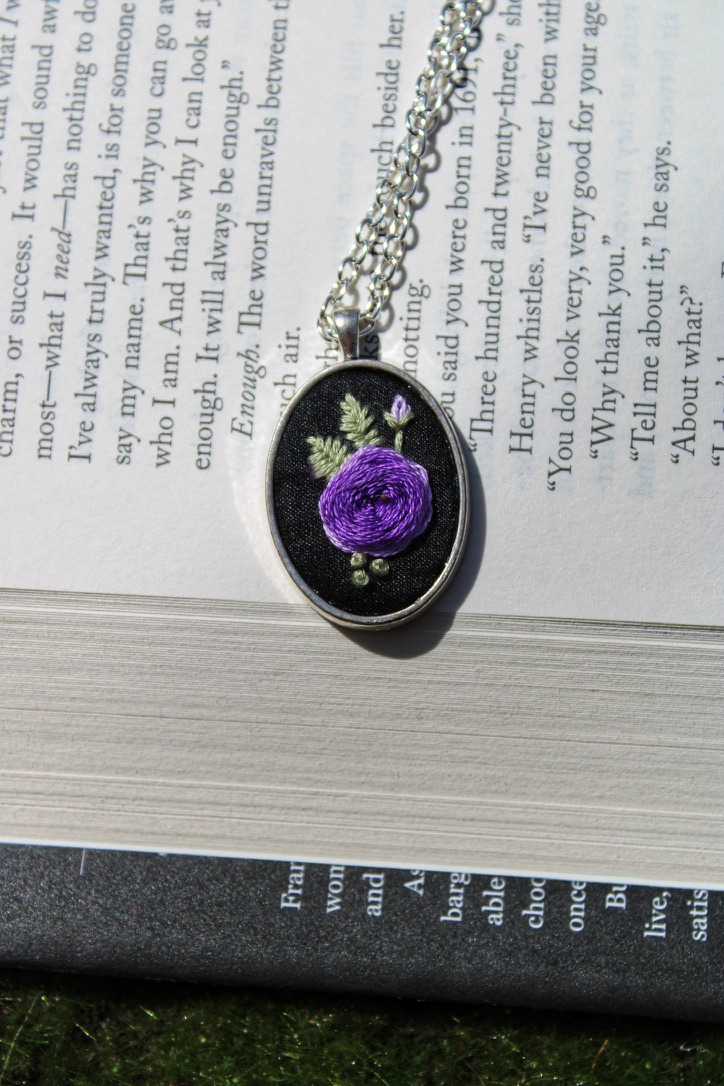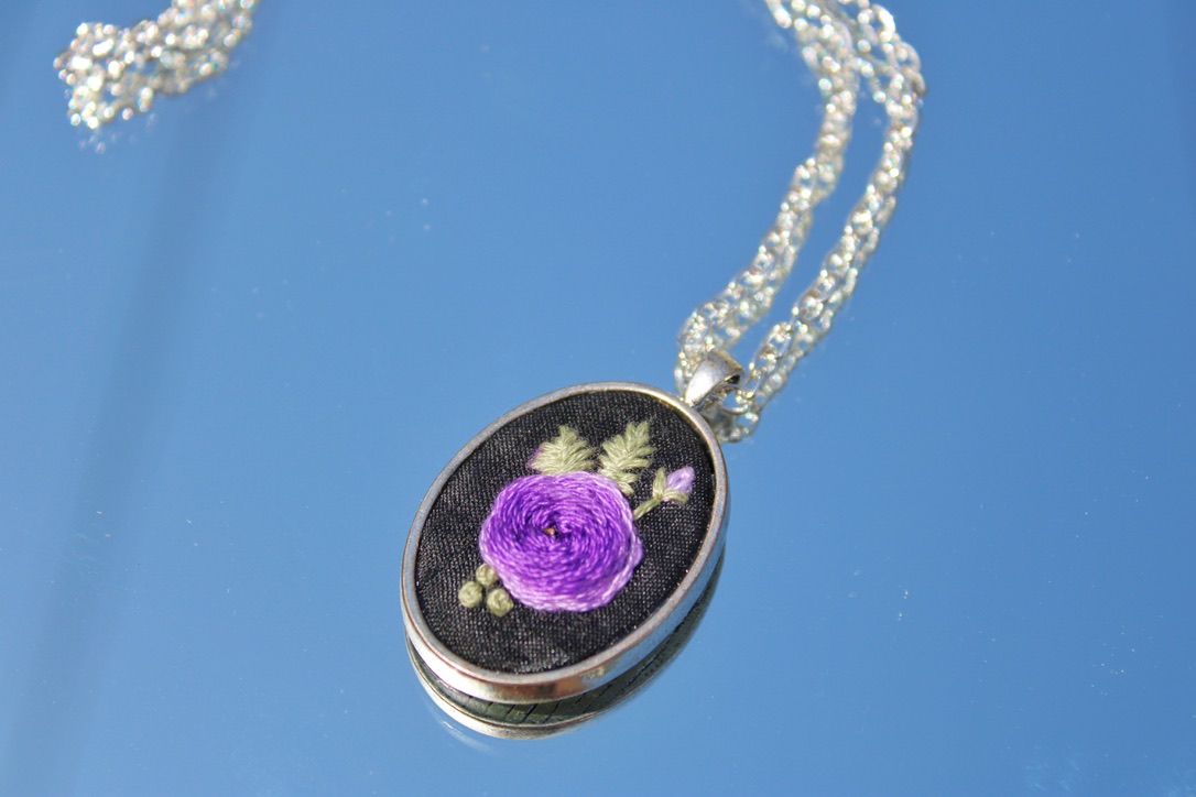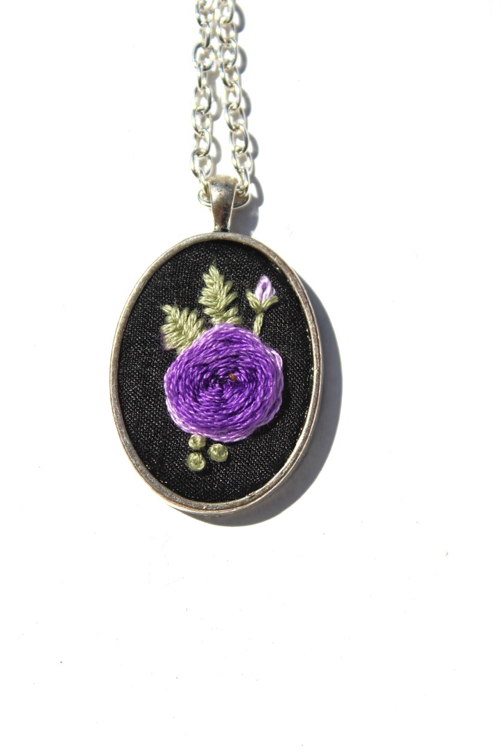 A striking blend of elegance and craftsmanship, this hand-embroidered necklace features a rich purple rose stitched onto a black fabric background. The intricate threadwork highlights the layered petals, accented by soft green leaves and a delicate purple bud. Framed in an oval silver-toned setting with a matching chain, this piece offers a timeless, slightly gothic charm that pairs beautifully with both casual and formal outfits. Perfect for lovers of floral jewellery, handmade art, and unique statement pieces.