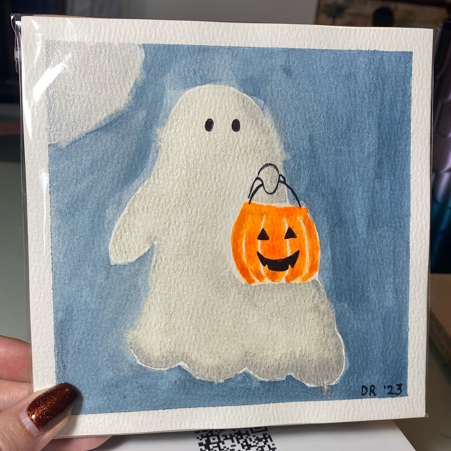 Halloween Ghost Watercolour with Pumpkin Pail – This charming 6×6 inch original watercolour painting features a whimsical ghost carrying a bright orange jack-o’-lantern candy bucket. Painted on professional cold-pressed watercolour paper, it blends spooky fun with playful charm, making it a perfect seasonal accent.