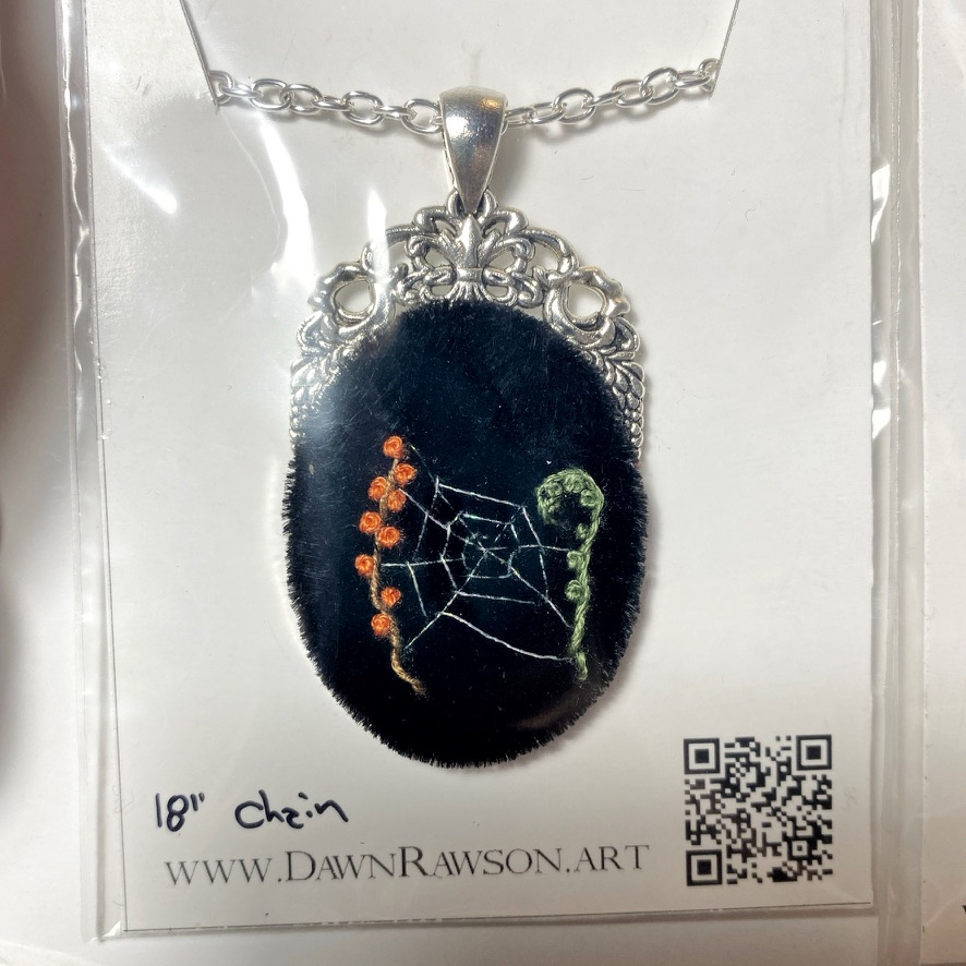 This embroidered necklace features a delicately stitched spiderweb accented by vibrant orange berries and a curling green fern, all set against rich black velvet. The detailed silver frame enhances the dark, gothic botanical theme, creating a striking yet wearable piece of art jewelry. Each element is hand embroidered, making this pendant a one-of-a-kind accessory perfect for lovers of woodland, witchy, or autumnal aesthetics. A unique necklace for those who embrace nature’s mysterious beauty.