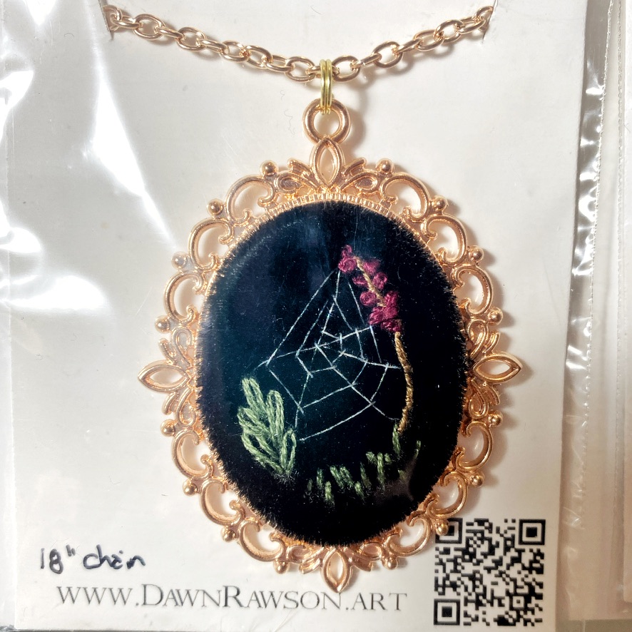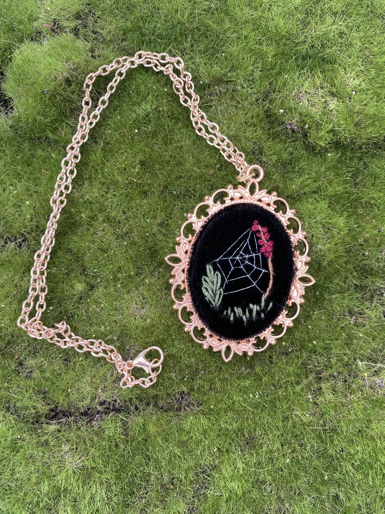 This embroidered necklace features a delicately stitched spiderweb accented by vibrant red berries and a fluffy green fern, all set against rich black velvet. The detailed gold frame enhances the dark, botanical theme, creating a striking yet wearable piece of art jewelry. Each element is hand embroidered, making this pendant a one-of-a-kind accessory perfect for lovers of woodland, witchy, or autumnal aesthetics. A unique necklace for those who embrace nature’s mysterious beauty.