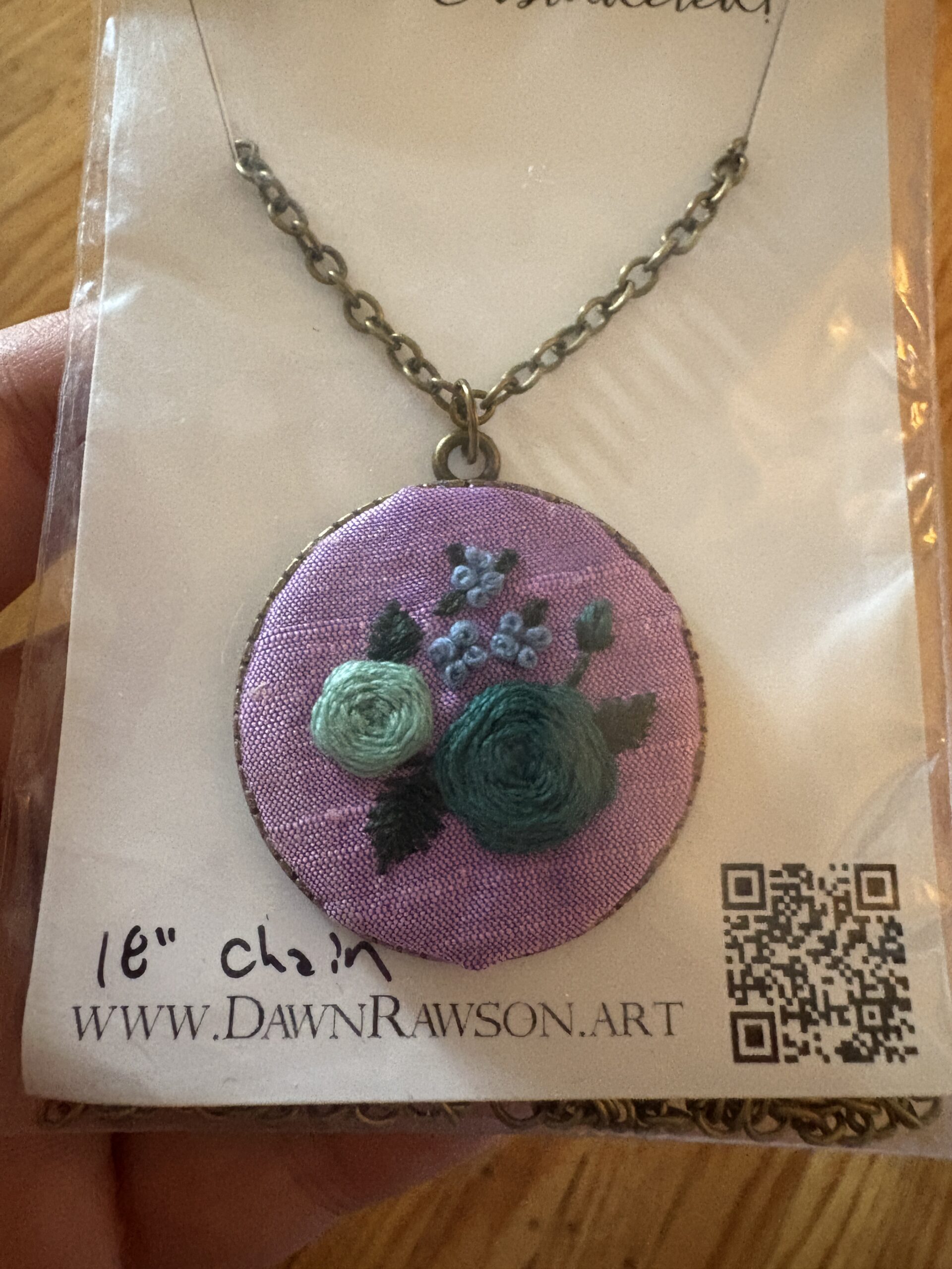 This embroidered pendant necklace brings together rich colours and delicate handwork in a wearable piece of art. Two roses—one in deep teal and one in soft mint—are surrounded by tiny blue blossoms and leafy accents, all carefully stitched by hand. The embroidery is worked on luminous purple silk, giving the flowers a vibrant, eye-catching backdrop.