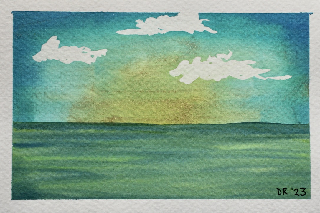 This original 4×6” watercolour painting captures the serene beauty of dawn breaking over the ocean. Gentle layers of green and teal wash across the sea, while the sky glows with the soft shimmer of early morning light. Wisps of white clouds drift above the horizon, adding a sense of calm and stillness to the scene.