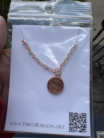 This Tiny Necklace says “main girl” and is on an 18″ chain.
