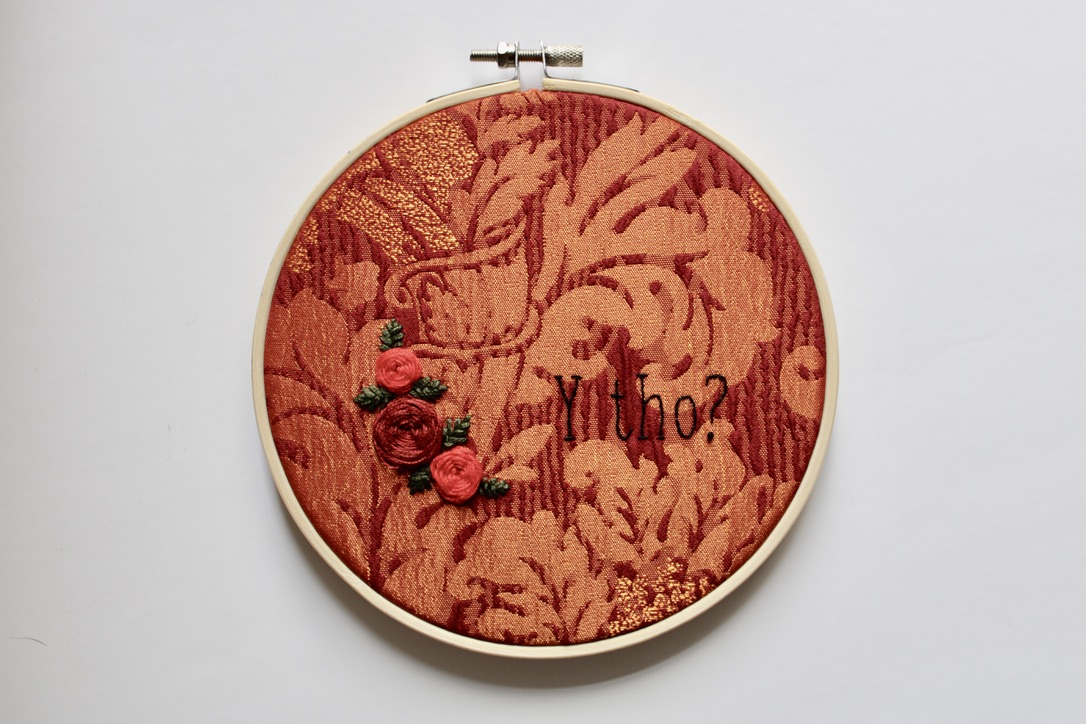Add a cheeky twist to your decor with this 6″ embroidery hoop featuring the sarcastic phrase “Y tho?” stitched in black thread. The text sits on a luxurious red and gold damask-style fabric, accented with three hand-embroidered roses in deep red and coral pink with leafy green details.