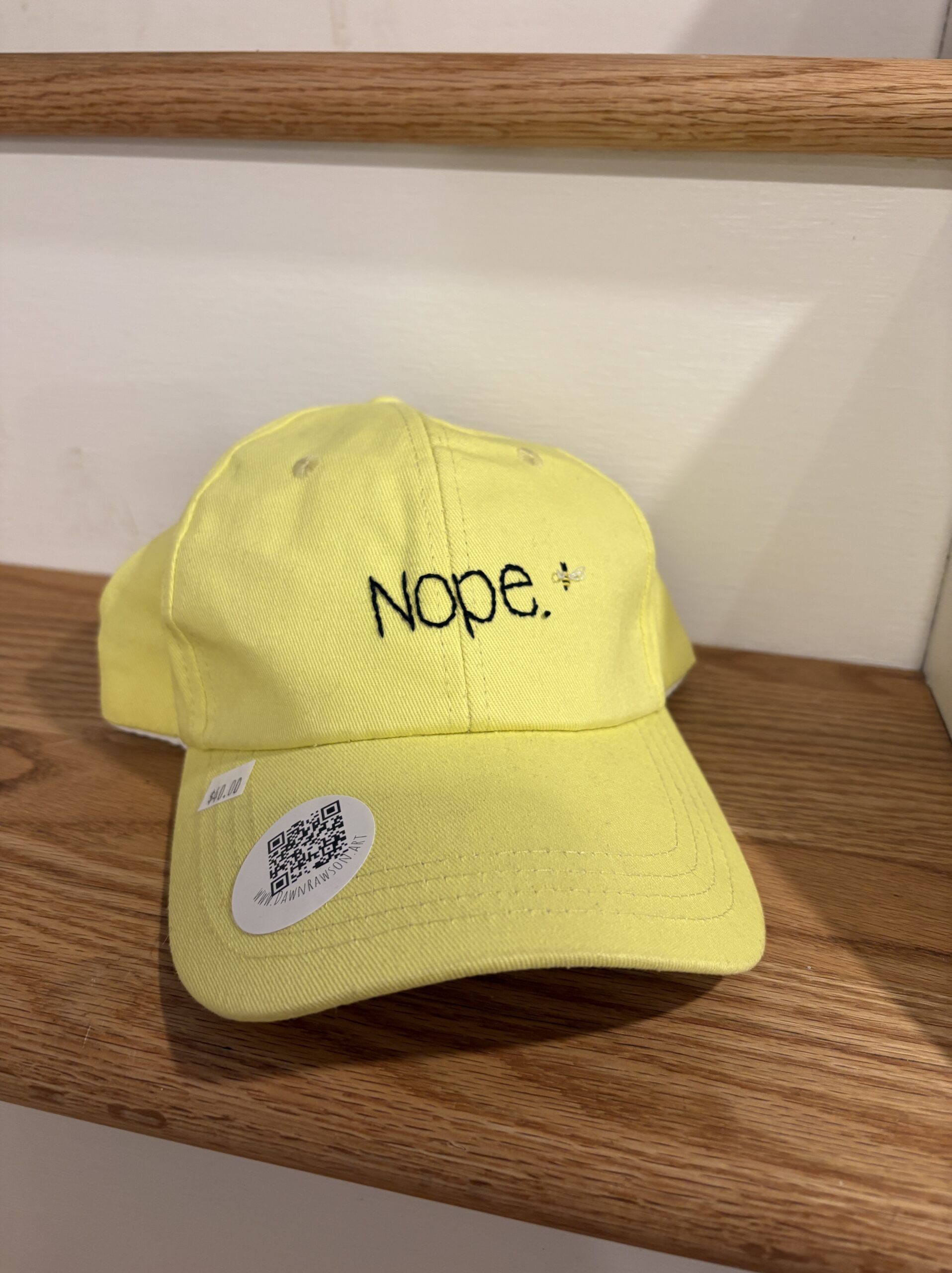 Bright, bold, and buzzing with attitude — this yellow baseball hat features “NOPE” in playful embroidery alongside a tiny bee. Perfect for days when you’re done with it all but still look cute doing it.